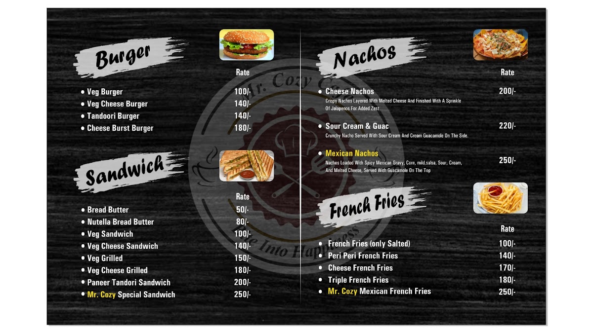 Welcome to Mr. Cozy Café, your new favorite spot in Surat, located conveniently at S-16, D-mart, Green Residency, opposite Madhav Crest in Dindoli. This charming café promises an inviting ambiance that’s perfect for gathering with family and friends.